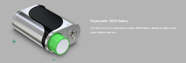 The iStick Pico 25 ingeniously packs a big 0.91-inch screen that offers a concise and clear interface, 2A quick charge capability and upgradeable firmware with preheat function in a compact, stylish yet powerful package. Powered by single 18650 battery, the iStick Pico 25 is capable of outputting a maximum power of 85W and can handle various tanks up to 25mm diameter. The ELLO atomizer that features the HW coil for ultimate flavor and retractable top for easy filling pairs with the iStick Pico 25 perfectly in terms of both appearance and performance.