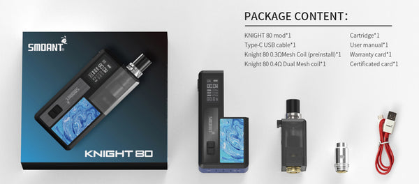 Smoant Knight 80 Kit is a delicate compact multifunctional RBA pod mod device. Smoant Knight 80 kit uses a single replaceable 18650 battery to provide vape support and can transmit power output up to 80W. Besides, the Smoant Knight 80 pod kit is equipped with an advanced AI smart ANT-chip and buck boost chip that supports atomizer memory function, can automatically adjust the output according to the coil and provide a constant output to provide the first-class flavor. It's worth noting the Knight pod kit compatible with all Smoant Pasito coils. It is also compatible with new design RBA that supports single and dual coil build. Compatible with a total of six types of coils. Displaying relevant vaping data on the 0.96 inch OLED Screen, the Smoant Knight 80 Kit relays important vaping info back to the user. As for the Knight Pods, it can store up to 4ml of e-juice, adopts a leak-proof system, independent air-flow control system, new child lock system. Compact, powerful performance, pure flavor, excellent vapor experience.