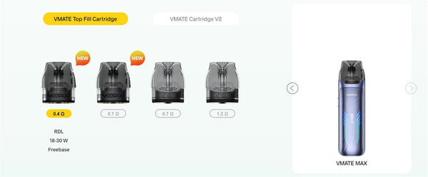 Cartridge Included: VMATE Top Fill Cartridge 0.4ohm; VMATE Top Fill Cartridge 0.7ohm