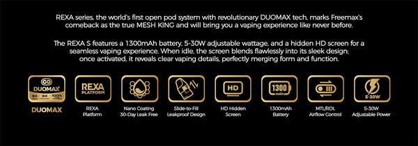 Freemax Rexa S Kit comes with a 1200mAh powerful battery, 2ml vape juice capacity, and supports long-time non-stop vaping. The Rexa S is a new line of the Freemax series,...