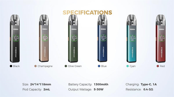 Freemax Rexa S Kit comes with a 1200mAh powerful battery, 2ml vape juice capacity, and supports long-time non-stop vaping. The Rexa S is a new line of the Freemax series, designed with a sleek and durable build for daily use. You can upgrade the e-juice capacity by replacing the pods, with a maximum 3ml capacity using compatible Freemax Rexs Series pods. Equipped with a 5-30W adjustable power system, it offers precise voltage control for customizable vaping experiences. Standard USB-C charging ensures reliable recharging while maintaining portability.