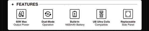The Lost Vape Centaurus B60 AIO Kit, offering a 5-60W range, Quest 2.0 Chipset, and the UB Ultra Coil compatible UB AIO Pod for vapor output. Constructed from durable stainless...