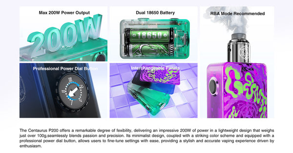 The Lost Vape Centaurus P200 Box Mod offers advanced technology and a sleek design. With dual 18650 batteries (not included) and 200W power, this mod provides a reliable and powerful...