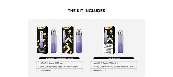 Find your vaping way with ease with ARCO El , a device is simple on the outside and intelligent within The minimalist design delivers an understated elegance and smart features demonstrate functionality , such as adaptive power , LED battery indicator and ARCO pods series compatibility , taking the complexity out of vaping.