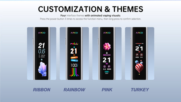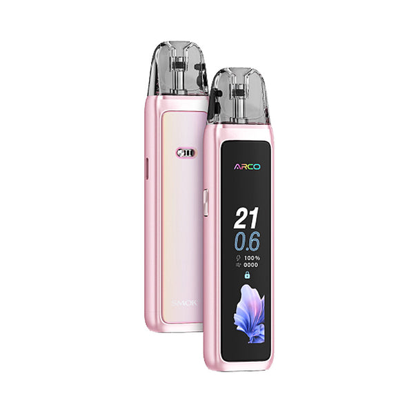The Smok ARCO MAX Pod Kit elevates vaping versatility through its multi-resistance ecosystem. Centered on a 2.25-inch TFT interface with four themes(Ribbon/Rainbow/Pink/Turkey), The glossy zinc alloy frame and premium IML back plate create a bold yet refined aesthetic . The CD-textured navigation button ensures precise control across its 5-30W adaptive output, powered by a 1300mAh cell featuring 1.5A QuickCharge (0-100% in 30 mins).