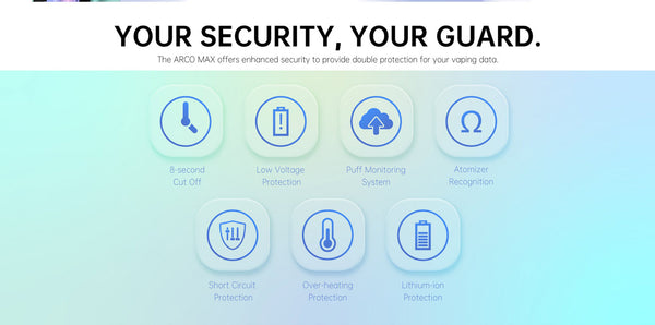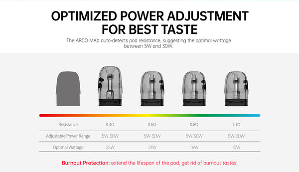 Compatible with ARCO Series cartridges (0.4ohm RDL/0.6ohm RDL-MTL/0.8ohm MTL/1.1ohm tight MTL), The SmartChip 3.0 auto-detects coil impedance (±0.05ohm accuracy) and syncs preset themes with corresponding wattage ranges.ARCO MAX ensures an immersive , long-lasting vaping journey Innovation keeps changing the vaping experience!