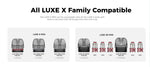 The LUXE X PRO can be compatible with all the LUXE X pods with built in coil and LUXE XR Empty Pod with GTX coils.