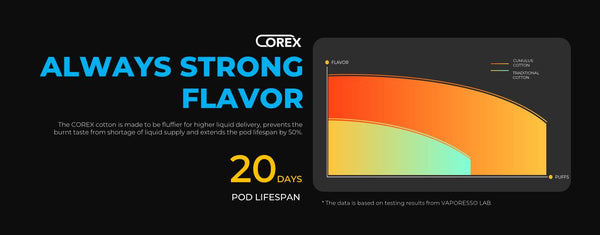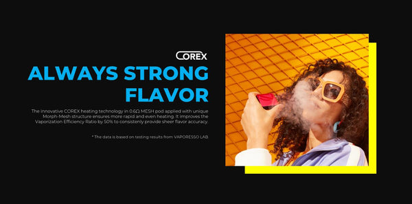 4. The innovative COREX heating technology applied with unique COREX Cotton and MORPH MESH, ensures more rapid and even heating to provide sheer flavor accuracy from the first to the last puff.
