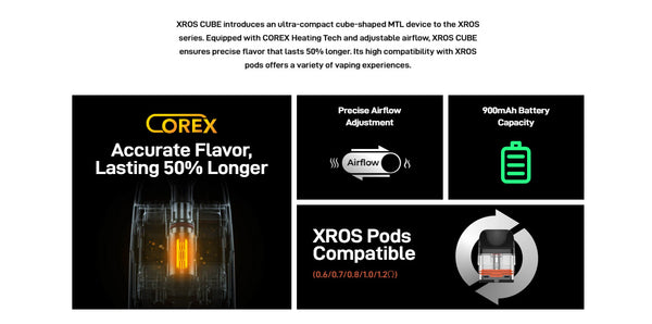 XROS Cube introduces an ultra-compact and cube-shaped MTL device to the XROS series. It is powered by a built-in 900mAh battery with Type-C charging to bring you longer vaping experience. Equipped with COREX Heating Tech and adjustable airflow, XROS Cube ensures precise flavor that lasts 50% longer. It is compatible with Vaporesso XROS Pod Cartridge 0.6ohm/0.7ohm/0.8ohm/1.0ohm/1.2ohm. Its high compatibility with XROS pods offers a variety of vaping experiences.