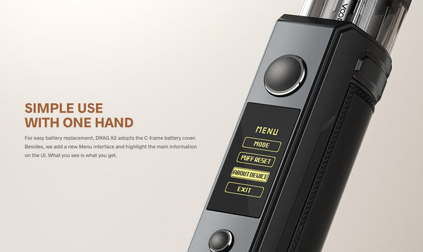 DRAG X2 is a pod mod with single external 18650 battery (not included in the package). The power range is from 5W to 80W.