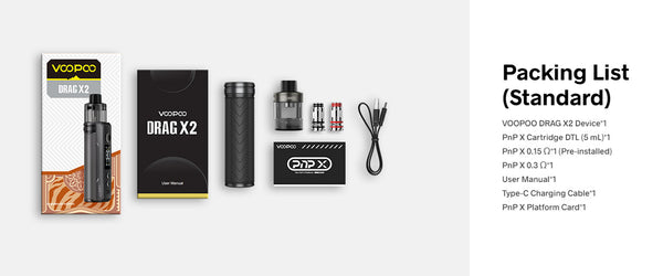 The standard cartridge for DRAG X2, PnP X Cartridge DTL , is the only one for the global and its compatible coil resistance is 0.15ohm and 0.3ohm. The standard coils are PnP X 0.15ohm and PnP X 0.3ohm. It is recommended to choose the e-liquid with 50%-70% VG and whose nicotine content of no more than 10 mg.