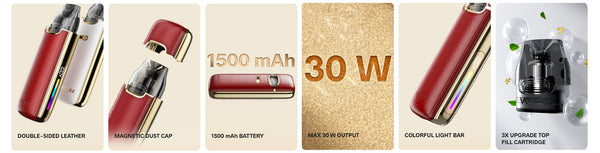 Building on the iconic design of the VMATE E, the latest VMATE E2 delivers even more fabulous elegance with an upgraded double-sided leather and magnetic cover. 3X upgraded new cartridges provide an enhanced pure vaping experience,and an increased power of 1500 mAh for multiple days of use.and power by built-in 1500mAh battery, and 30w max output wattage,and the 3ml volume ejuice capacity for daily use without frequent refilling. compatible with all VMATE Top Fill Cartridges and VMATE side filling series.The gradient color light bar on the side of the device,along with a percentage display of the battery level.